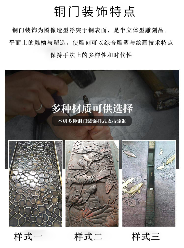 銅門(mén)裝飾為圖像造型浮突于銅表面,是半立體型雕刻品平面上的雕槽與塑造,使雕刻可以綜合雕塑與繪畫(huà)技術(shù)特點(diǎn)